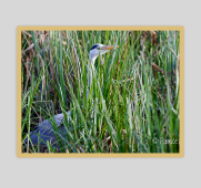 Les eaux sont hautes et la pêche devient difficile, le héron se camoufle au mieux pour attendre le poisson dans les hautes herbes.